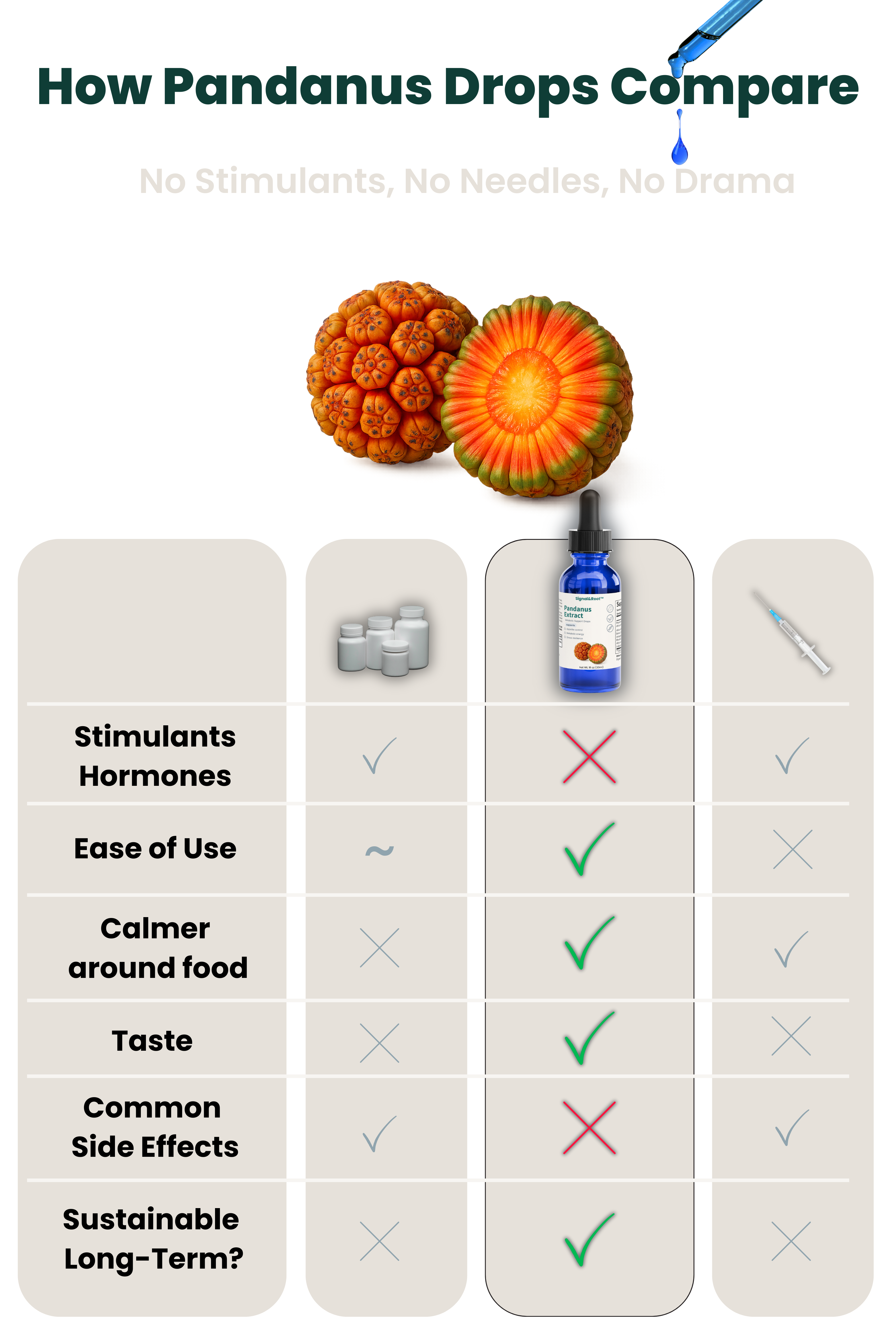 No. Absolutely not. Pandanus Drops support your body's natural satiety signals, so you naturally feel satisfied—not deprived. Many users find they make gentler, more intuitive food choices (less stress snacking, smaller portions) without rigid rules. There are no forbidden foods, no meal plans, no "cheating."